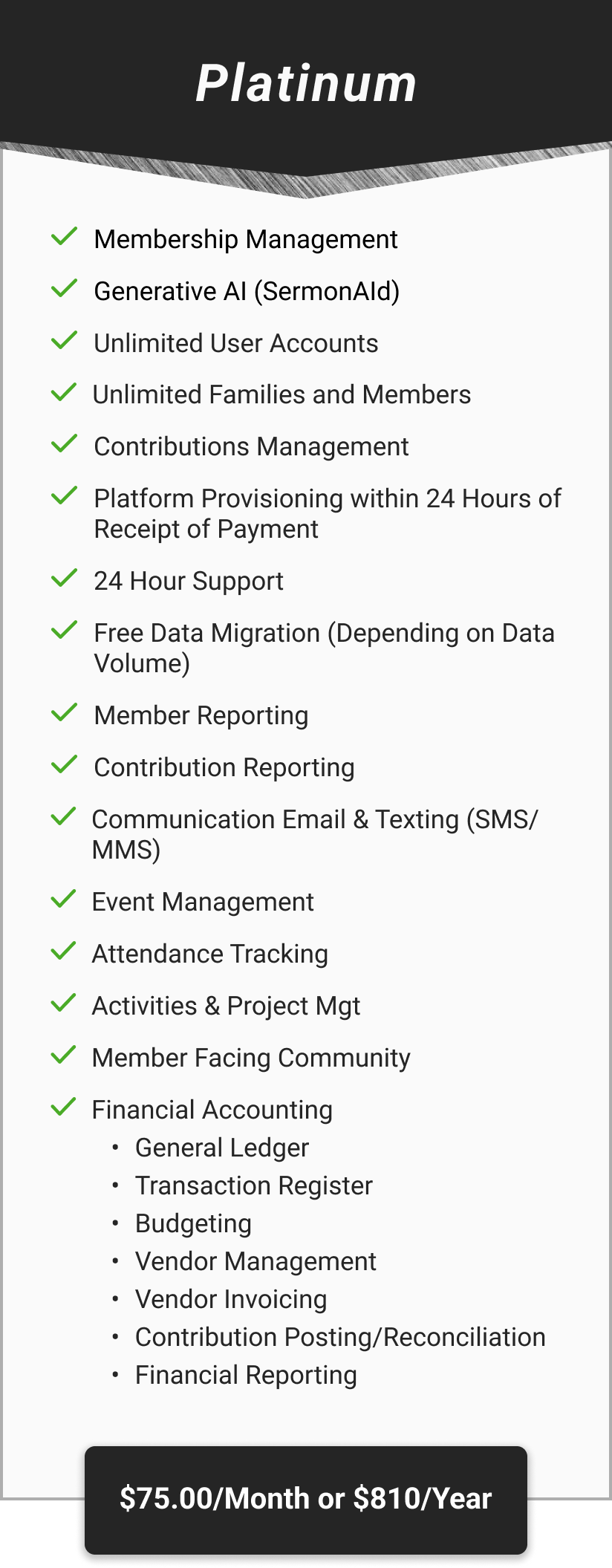 Platinum: $74.99/Month or $810.00/Year