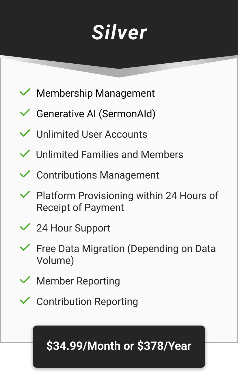 ChurchPro+ is a comprehensive Church Management System designed specifically for Religious Organizations. With its advanced features and user-friendly interface, organizations can efficiently manage their organization, membership, streamline communication with members, and enhance overall organizational efficiency. This powerful system offers a range of features, including Donation processing, Project Management, Event Processing, a Member facing Portal and a complete Accounting System. With the incorporation of Artificial Intelligence, the Application is a must have for Faith-Based organizations.